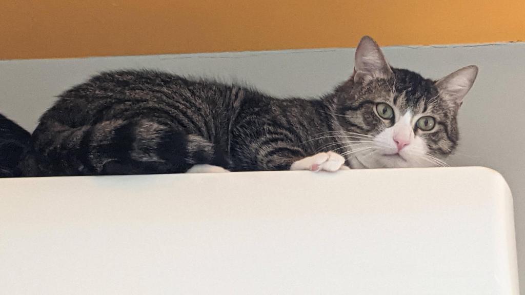 “Доброе утро)Маленькими шагами меняется ,хотя и под кровать прятаться не перестает)Но если в ту комнату закрыть дверь,то котик отлично проводит время .Ночью спит на стуле ,сейчас лежит на поддокольнике дышит свежим воздухом)У нас стоят решетки на окне)Отличный аппетит,чаще съедает всё до идеально чистой тарелки))Иногда по ночам очень активный ,бегает ,что нибудь со стола скинет и гоняет)) Телевизор по прежнему любимое занятие)). Он знает одно место ,куда спрятаться))Но когда мы его там находим за микроволновкой и там нет места убежать ,мы его гладим))Он не рычит,не царапается ,но может поскулить). Как дочка говорит,ну как же так кот в доме есть ,а гладить его нельзя))Он на стуле лежит,если она руку к нему протянет,то он под стул спрыгнет))Но первые дни ,он только ключ в замке слышал и сразу убегал под кровать..а сейчас остаётся лежать)