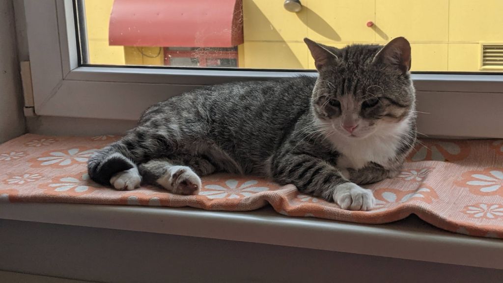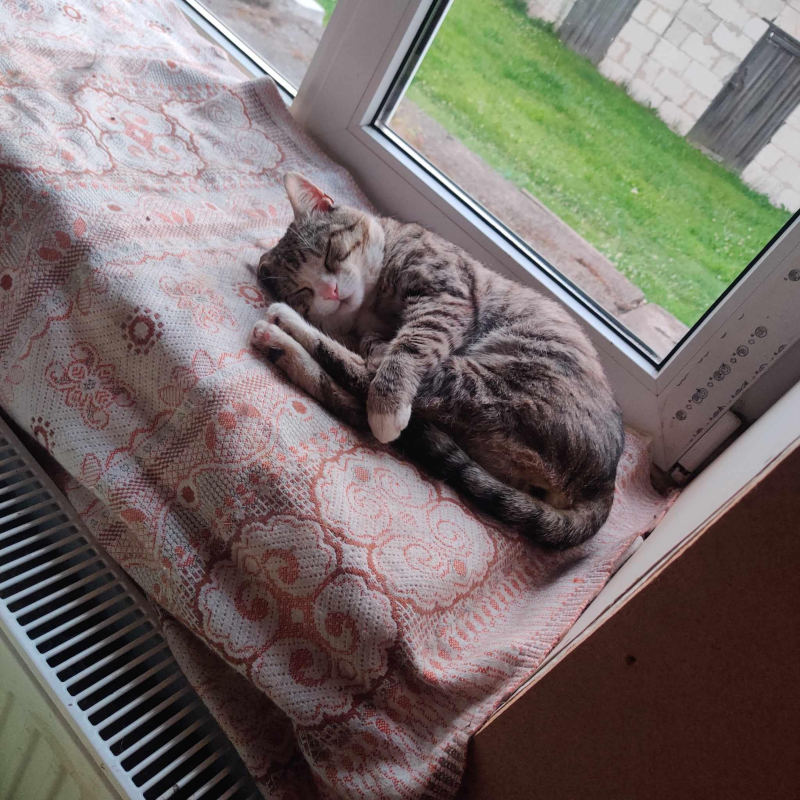 See vahva triibik jõudis Nelja Käpa hoole alla umbes kuu aega tagasi. Aga enne seda oli kiisu pikalt hulkunud Sompa kandis. Murlõka on väga-väga sõbralik ja juba tema nurrumootor ei käivitu esimese pai peale, vaid juba siis, kui inimene talle otsa vaatab! ![]()